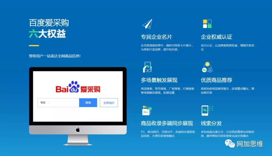 通過網(wǎng)加思維入駐愛采購的高級會員可以享受數(shù)據(jù)推送到百度愛采購平臺的機會,并可在百度搜索結(jié)果頁擁有專屬企業(yè)名片,企業(yè)信息和優(yōu)質(zhì)商品同步展現(xiàn);并且獲得百度信譽認證,強化品牌認知,凸顯企業(yè)實力, 增強客戶信任度。實現(xiàn)PC 端、移動端、百度APP 多端展現(xiàn),在為客戶做品牌宣傳的同時,強化產(chǎn)品曝光,提高成單機會。
