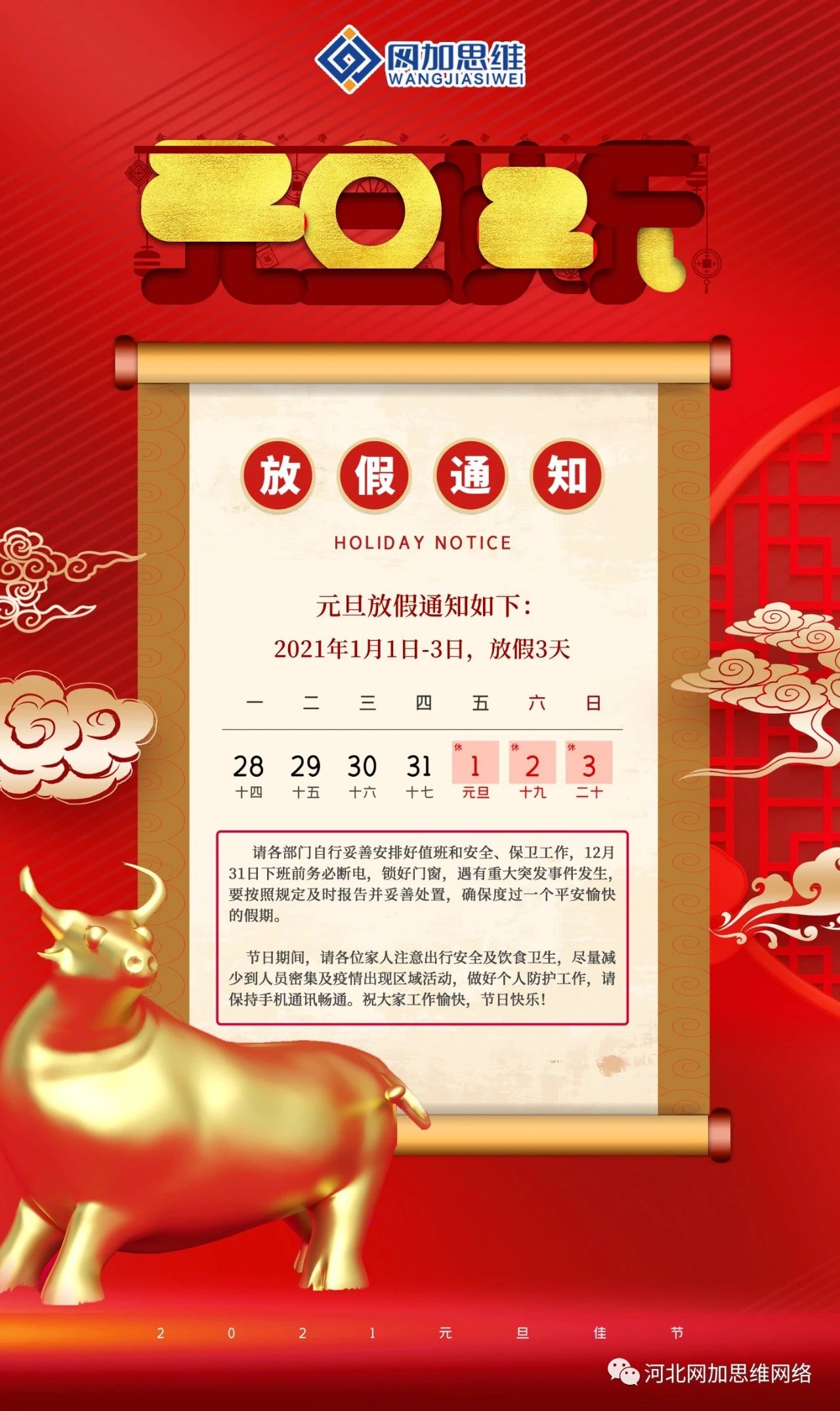 值此新一年到來之際,網(wǎng)加思維全體員工祝網(wǎng)加摯友們:元旦快樂,牛年吉祥,年年皆勝意,歲歲都?xì)g愉。